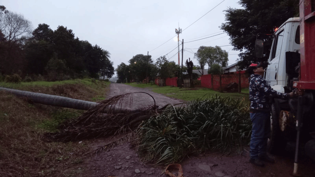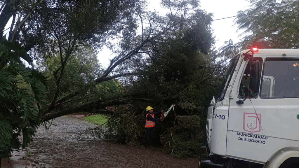 El municipio de Eldorado desplegó cuadrillas desde la noche del martes para limpiar calles, retirar árboles caídos y asistir a vecinos tras el fuerte temporal.