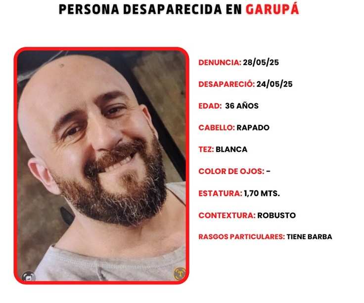 La Policía de Misiones mantiene activo un amplio operativo de búsqueda para dar con el paradero de Bonahon Martin, un hombre de 36 años que fue visto por última vez el sábado 24 de mayo, cuando salió de su domicilio en el barrio Santa Cruz de Garupá con destino a su lugar de trabajo y no volvió a comunicarse con su entorno.