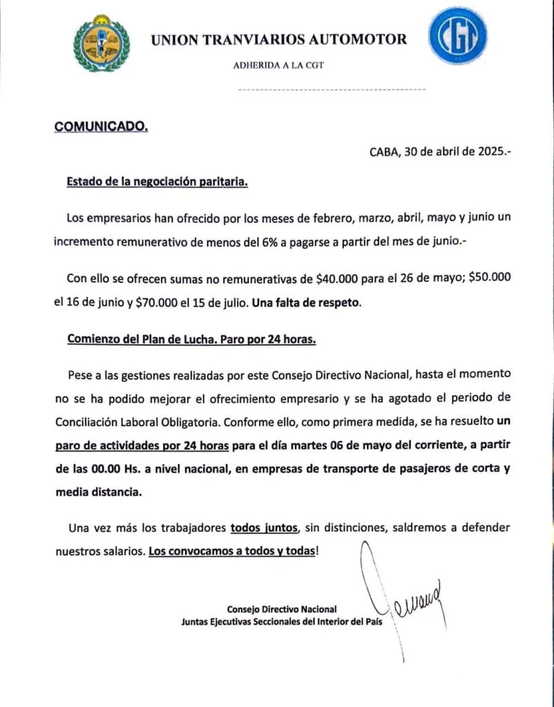 La UTA convocó a un paro nacional de colectivos por 24 horas este martes 6 de mayo, ante la falta de avances en la negociación salarial con las cámaras empresarias del transporte.