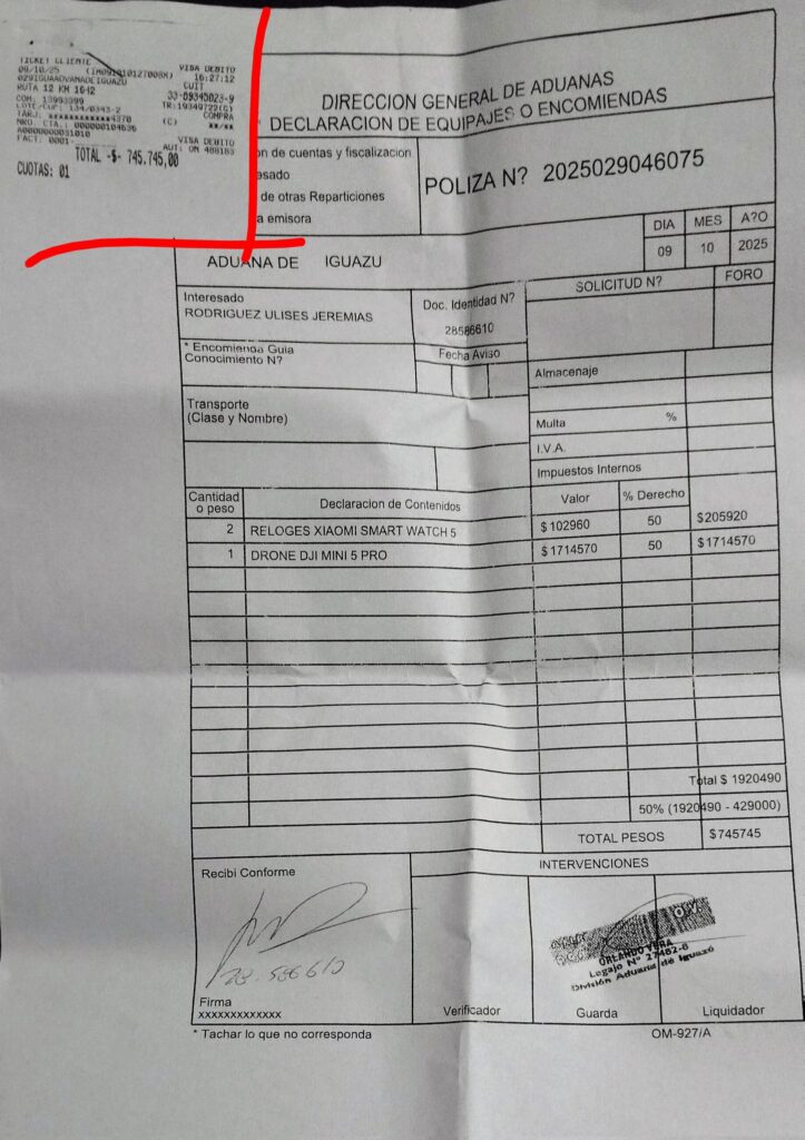 Según relató Rodríguez, el hecho ocurrió el 9 de octubre, cuando regresaba de Paraguay y fue demorado por personal de aduana. “Mostré lo que había comprado, entre eso un dron. Me indicaron que debía pagar el tributo correspondiente, pero el monto me pareció elevado. Aun así, aboné con tarjeta de débito porque quería regularizar la situación”, explicó.