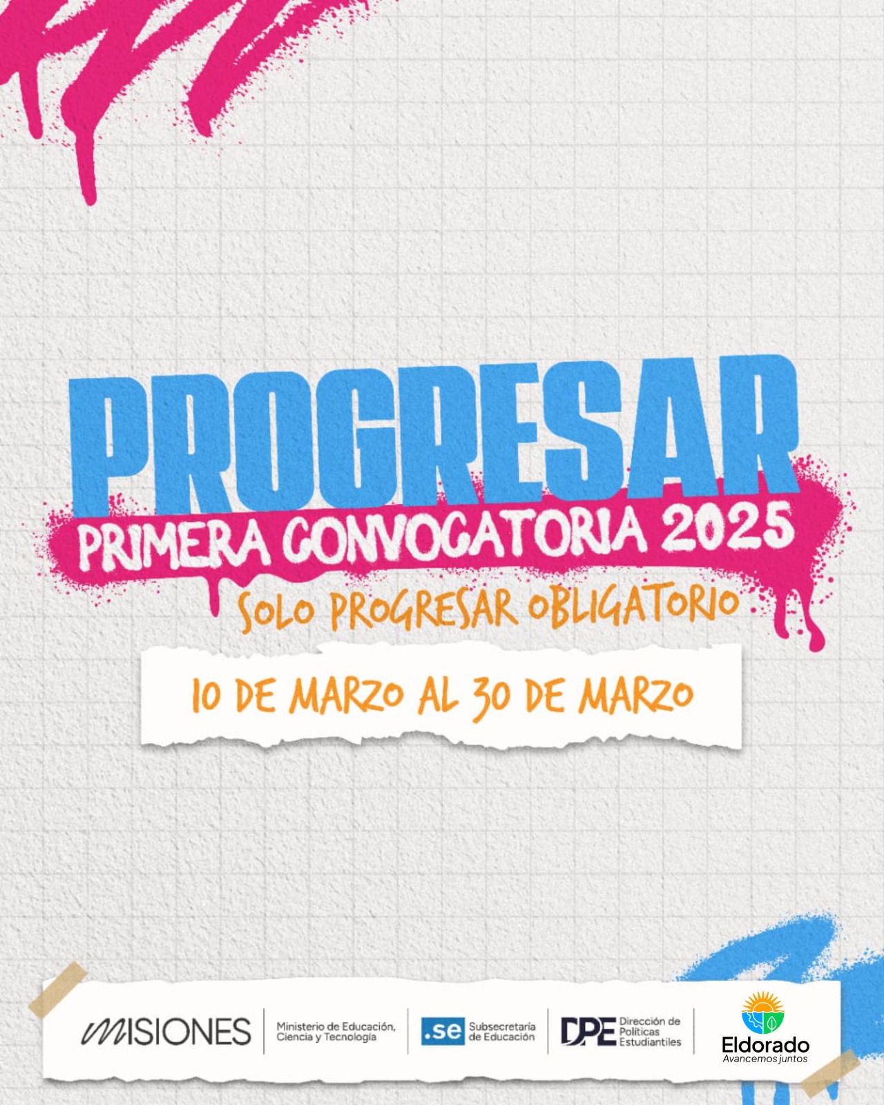 El Polo Académico de la Municipalidad de Eldorado informa que ya se encuentra habilitada la inscripción para la Primera Convocatoria 2025 de las Becas Progresar, destinadas a jóvenes que deseen finalizar o continuar sus estudios. El período de inscripción estará abierto hasta el 30 de marzo.