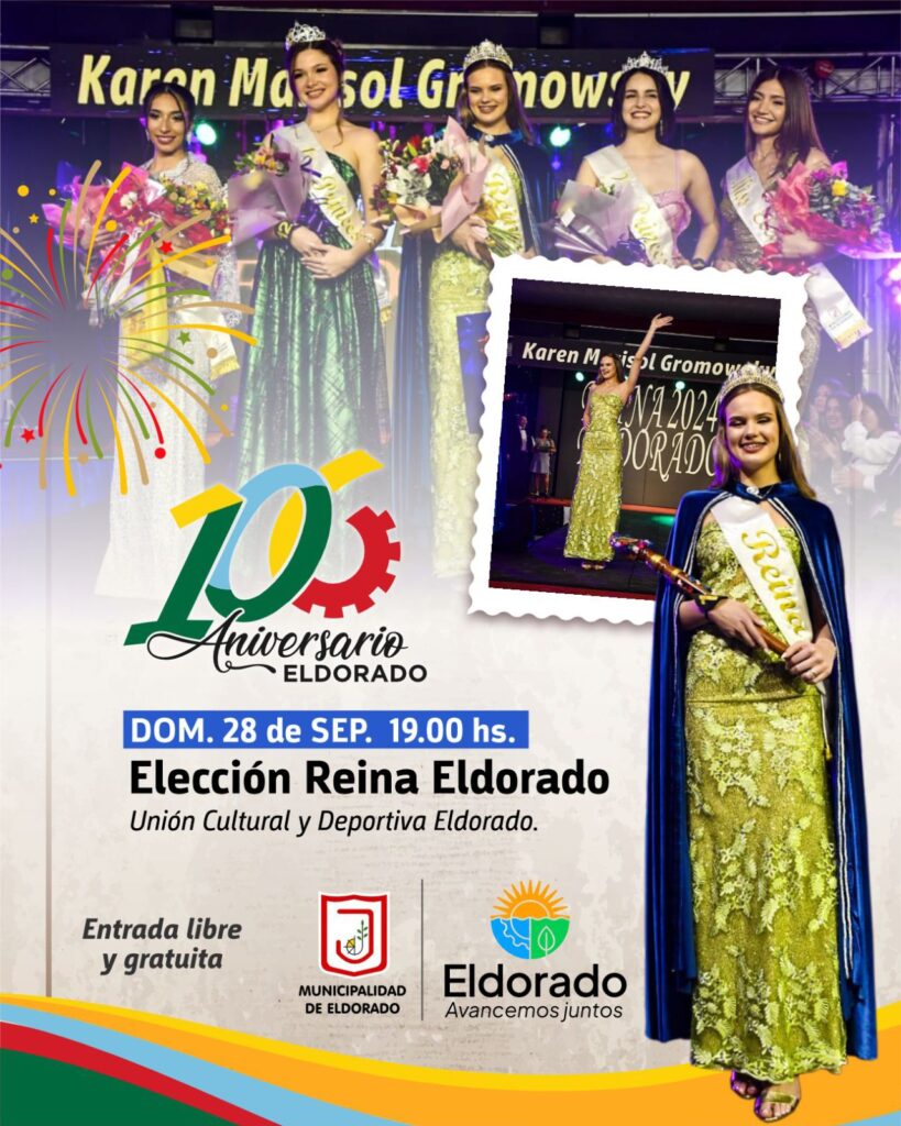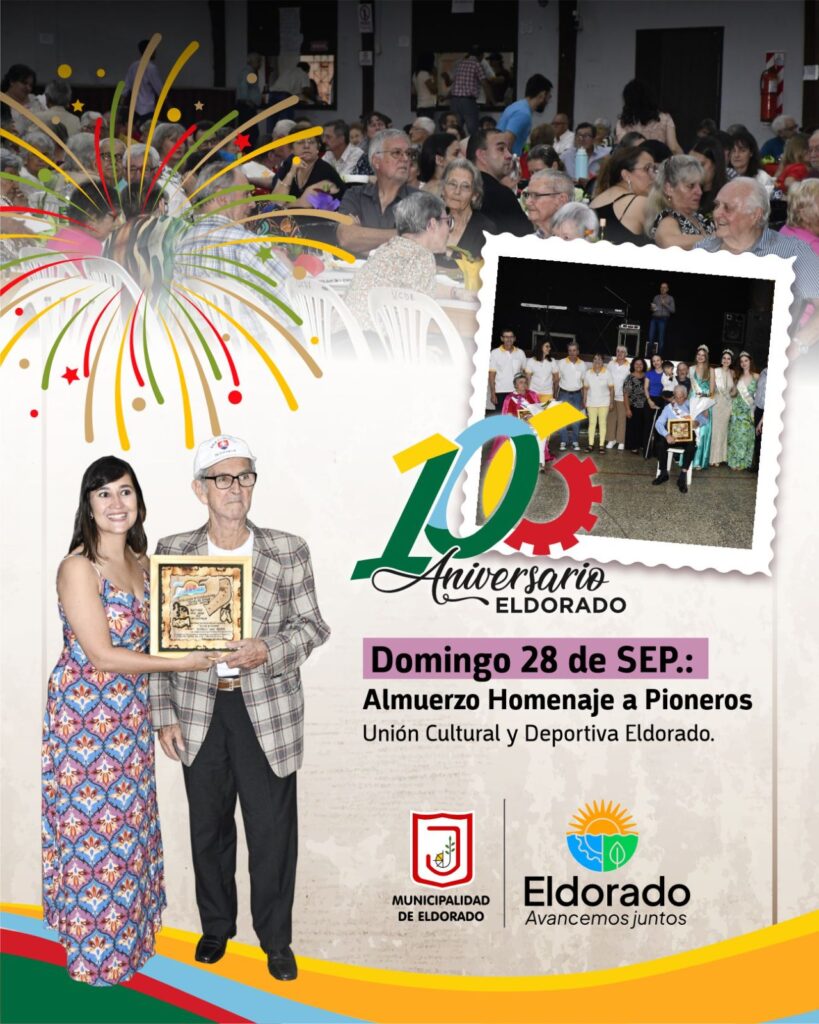 El domingo 28, al mediodía, se realizará el tradicional Almuerzo de los Pioneros en la Unión Cultural, en homenaje a quienes forjaron los inicios de la Capital del Trabajo. Ese mismo día, a las 19 horas, se llevará a cabo la Elección de la Reina de Eldorado 2025, también en la Unión Cultural.