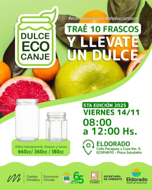 La Secretaría de Ambiente de la Municipalidad de Eldorado, en conjunto con la Escuela Agrotécnica Eldorado, realizará una nueva edición del “Dulce Ecocanje” este viernes 14 de noviembre, de 8 a 12 horas, en el Ecopunto de la Plaza Saludable, ubicada en avenida Paraguay y calle Cuyo (Km 9).