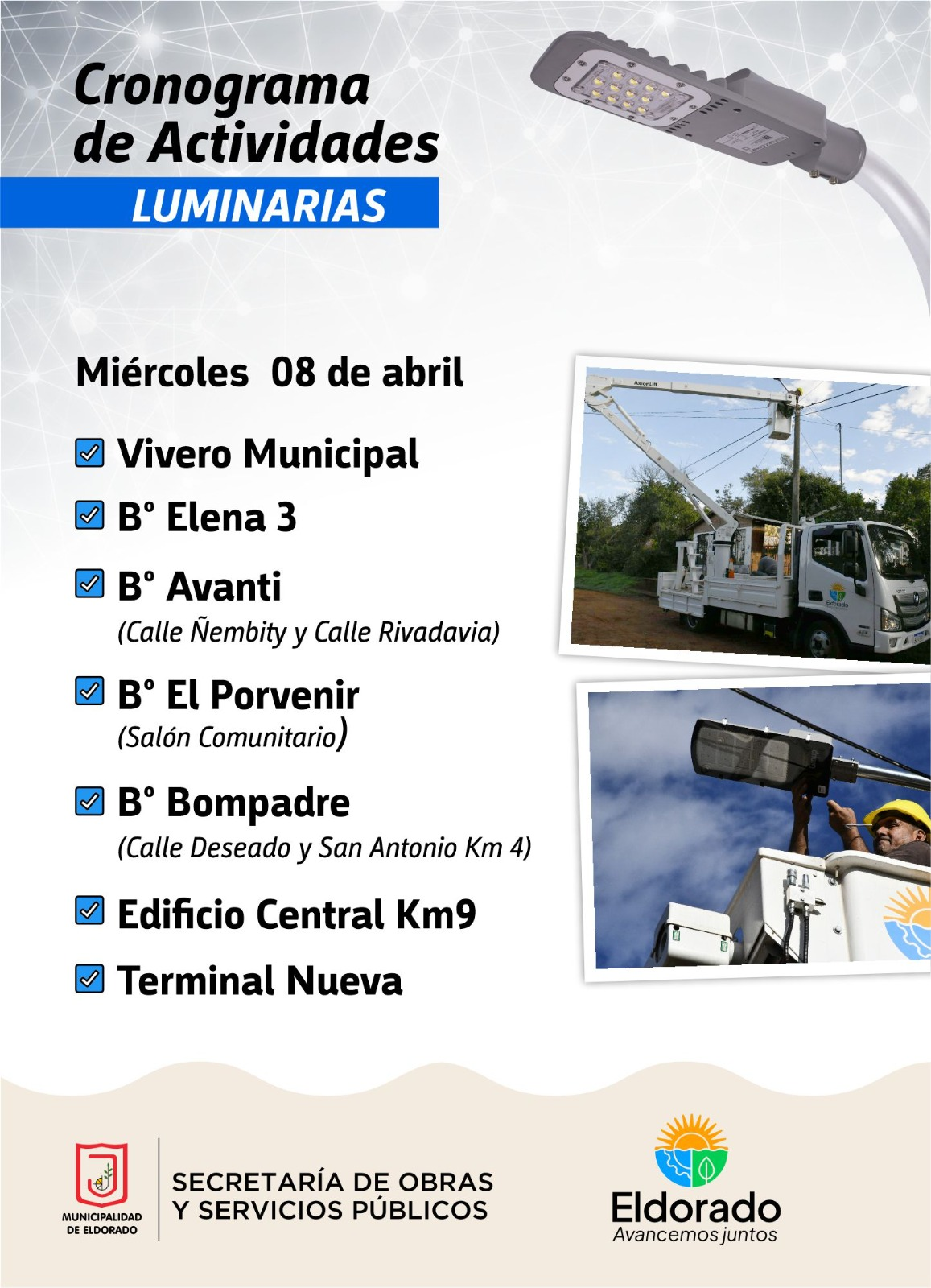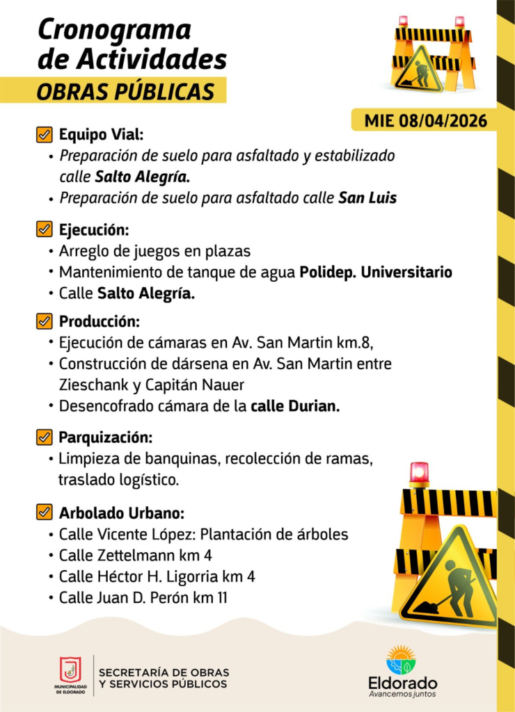 La Municipalidad de Eldorado puso en marcha un nuevo cronograma integral de trabajos para este miércoles 8 de abril de 2026, con intervenciones simultáneas en calles, barrios y espacios públicos.