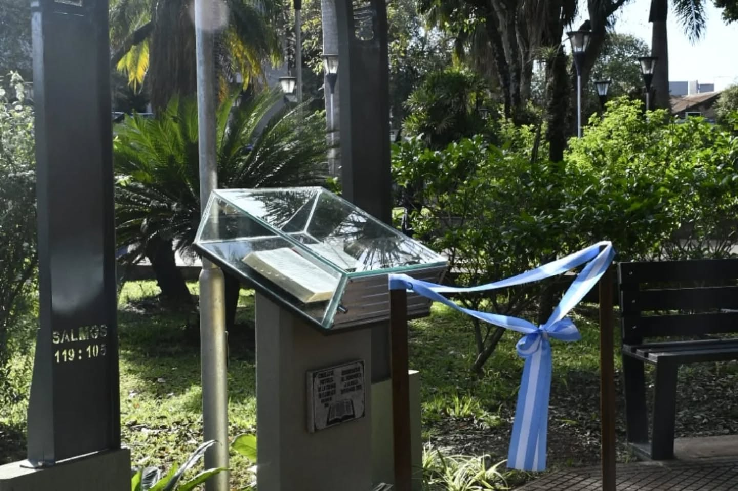 Eldorado reinauguró el Monumento a la Biblia en Plaza Sarmiento con autoridades, pastores y vecinos. El espacio recuperó la caja original y sumó un arco alusivo, fortaleciendo su valor simbólico.
