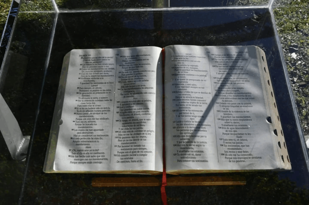 El espacio, creado en la inauguración de la plaza, contaba con una cabina donde se colocaba la Biblia y un encargado renovaba diariamente la lectura. Con el tiempo, la estructura se deterioró y el libro fue sustraído.