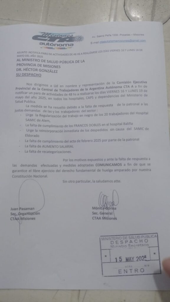 El conflicto en el Hospital SAMIC de Eldorado se mantiene y se profundiza. Mañana viernes 16 y el lunes 19 de mayo se llevará adelante un paro provincial convocado por la CTA Autónoma, lo que afectará la atención en hospitales y Centros de Atención Primaria de la Salud (CAPS) de toda Misiones. Así lo confirmó Marisa Dering, delegada de ATE, quien señaló que la medida de fuerza responde a la falta de respuestas concretas por parte del gobierno provincial y de las autoridades sanitarias.