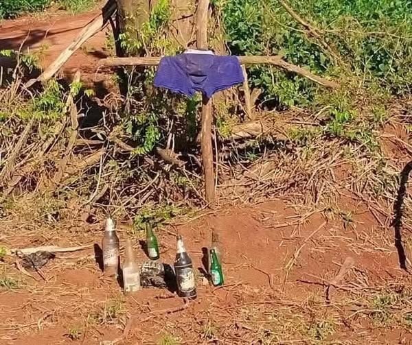 En el lugar se observó una cruz armada con ramas clavadas en el suelo, rodeada por botellas y envases dispuestos en forma circular.