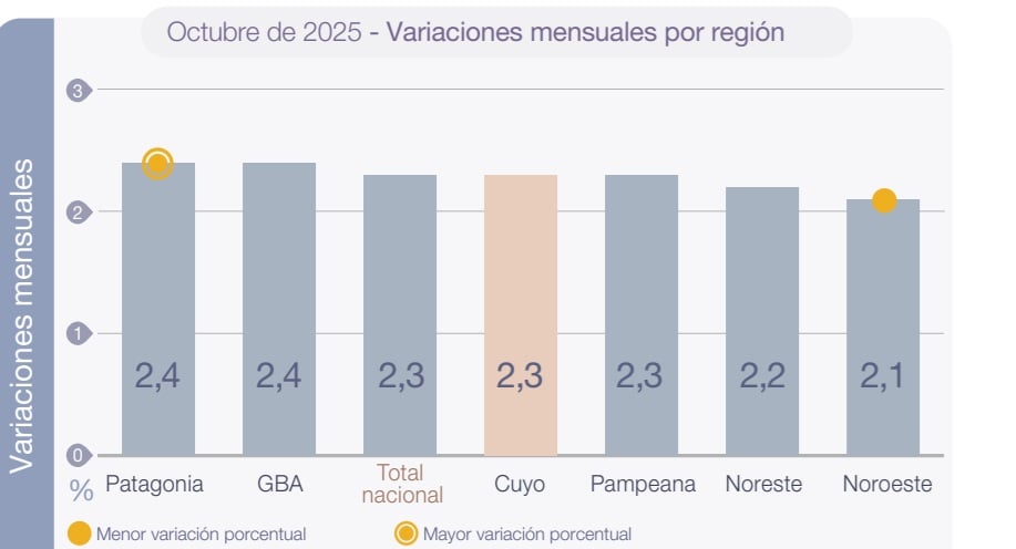 Otras regiones, como el Gran Buenos Aires (GBA) y la Patagonia, mostraron las variaciones más altas, ambas con un 2,4%, mientras que la región Pampeana y Cuyo igualaron la media nacional con un 2,3%3.