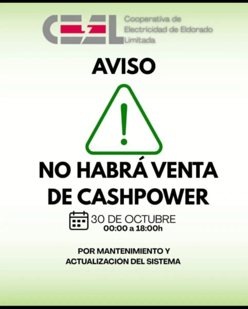 La Cooperativa de Electricidad Eldorado Limitada (CEEL) comunicó a sus usuarios que el próximo jueves 30 de octubre se interrumpirá la venta de Cashpower —sistema de energía prepaga— por tareas de mantenimiento y actualización del sistema informático.