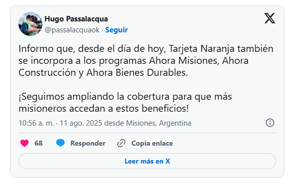 El gobernador Hugo Passalacqua informó que Tarjeta Naranja se incorporó hoy a los programas Ahora Misiones, Ahora Construcción y Ahora Bienes Durables, que estaban disponibles para tarjetas de crédito de los bancos Macro, Galicia y Credicoop.