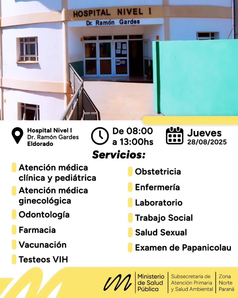 Este jueves 28, a partir de las 08:00 horas, el Hospital Nivel 1 Dr. Ramón Gardes llevará a cabo un operativo de salud destinado a la comunidad. La atención se brindará por orden de llegada y sin necesidad de turno previo.