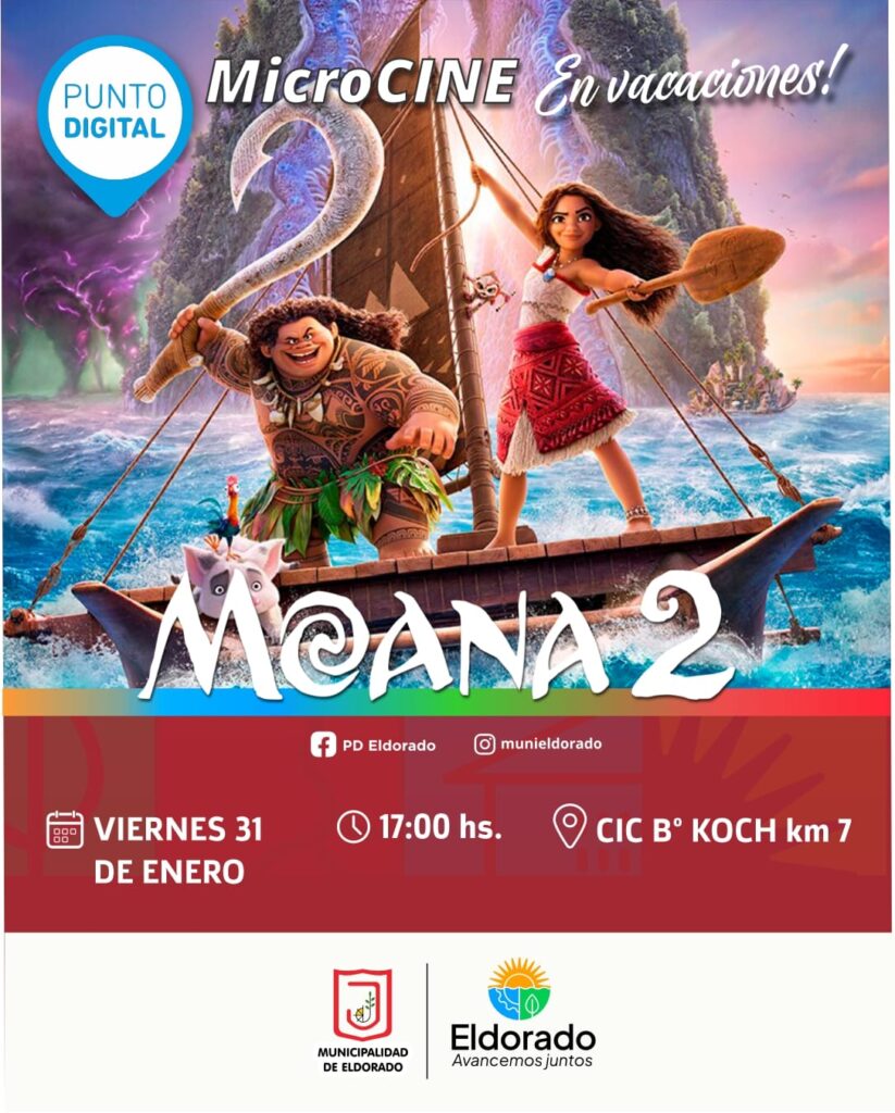 Este viernes 31 de enero a las 17:00, vecinos de Eldorado podrán disfrutar de Moana 2 en el CIC del barrio Koch, kilómetro 7. La función es libre y gratuita, ofreciendo una propuesta recreativa para toda la familia.