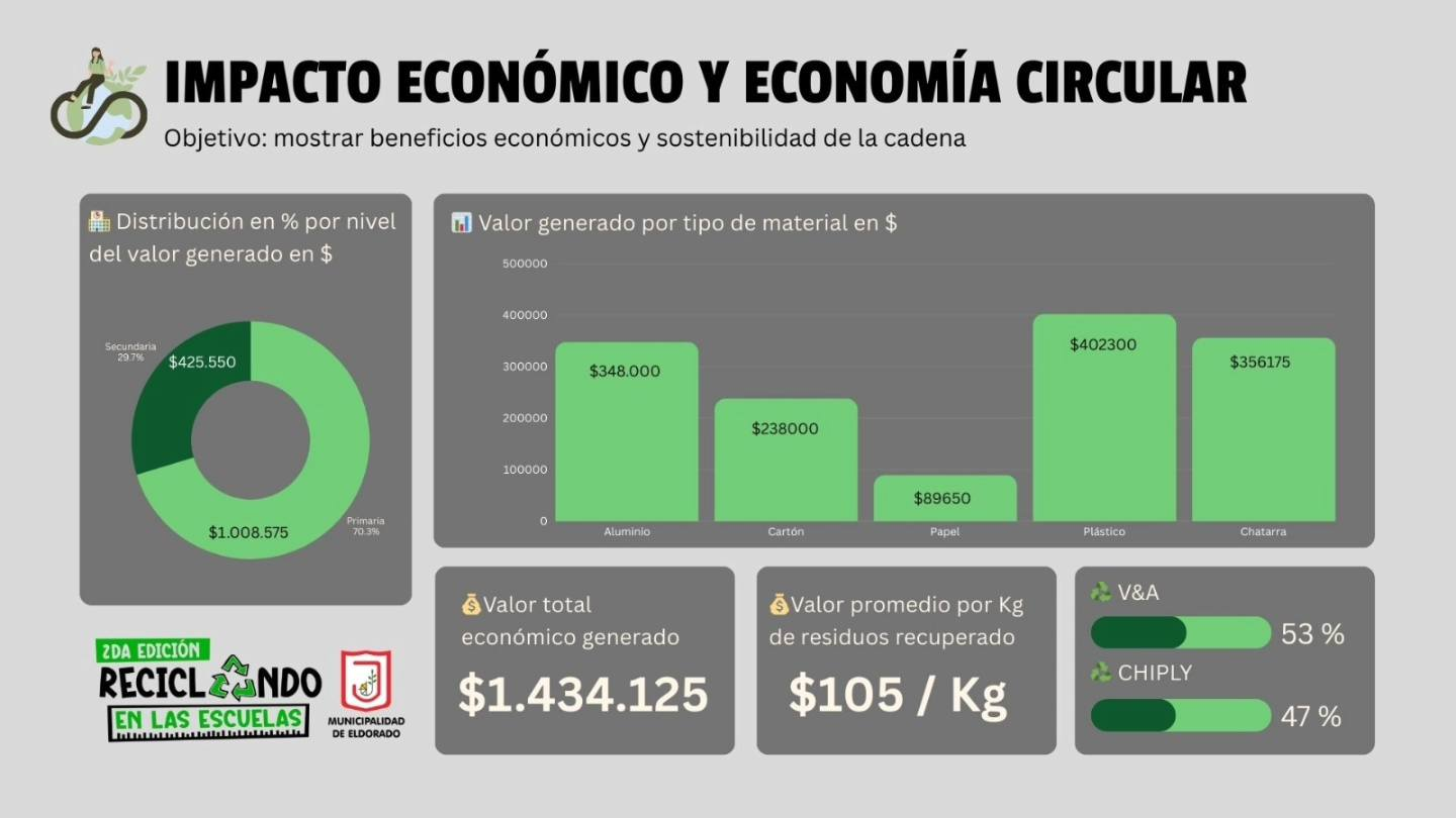 El informe oficial detalló que la chatarra representó el 35% del total, seguida por cartón (34,7%), plástico (14,7%), papel (13,2%) y aluminio (2,5%). En conjunto, la iniciativa generó un impacto económico de $1.434.125, que se distribuyó entre las escuelas participantes.