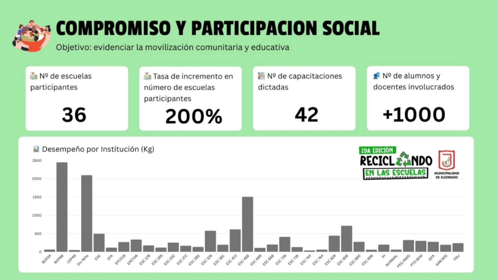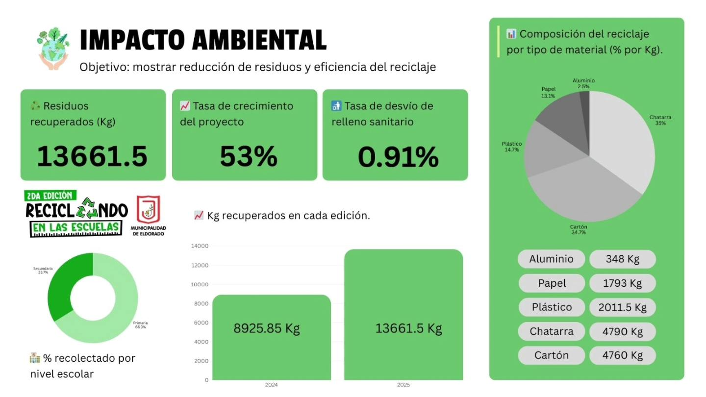 La Municipalidad de Eldorado presentó los resultados de la segunda edición del concurso “Reciclando en las Escuelas”, que alcanzó un récord de 13.661,5 kilos de materiales recuperados. El número representa un crecimiento del 53% respecto al 2024 y contó con la participación de 36 instituciones educativas, involucrando a más de mil alumnos y docentes.