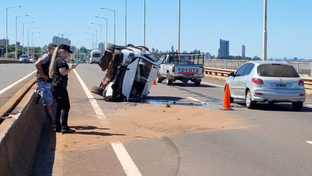 Un automovilista protagonizó un vuelco este jueves en el puente sobre el arroyo Zaimán, ubicado en la autovía del acceso sur de la ruta 105, luego de perder el control de su vehículo.
